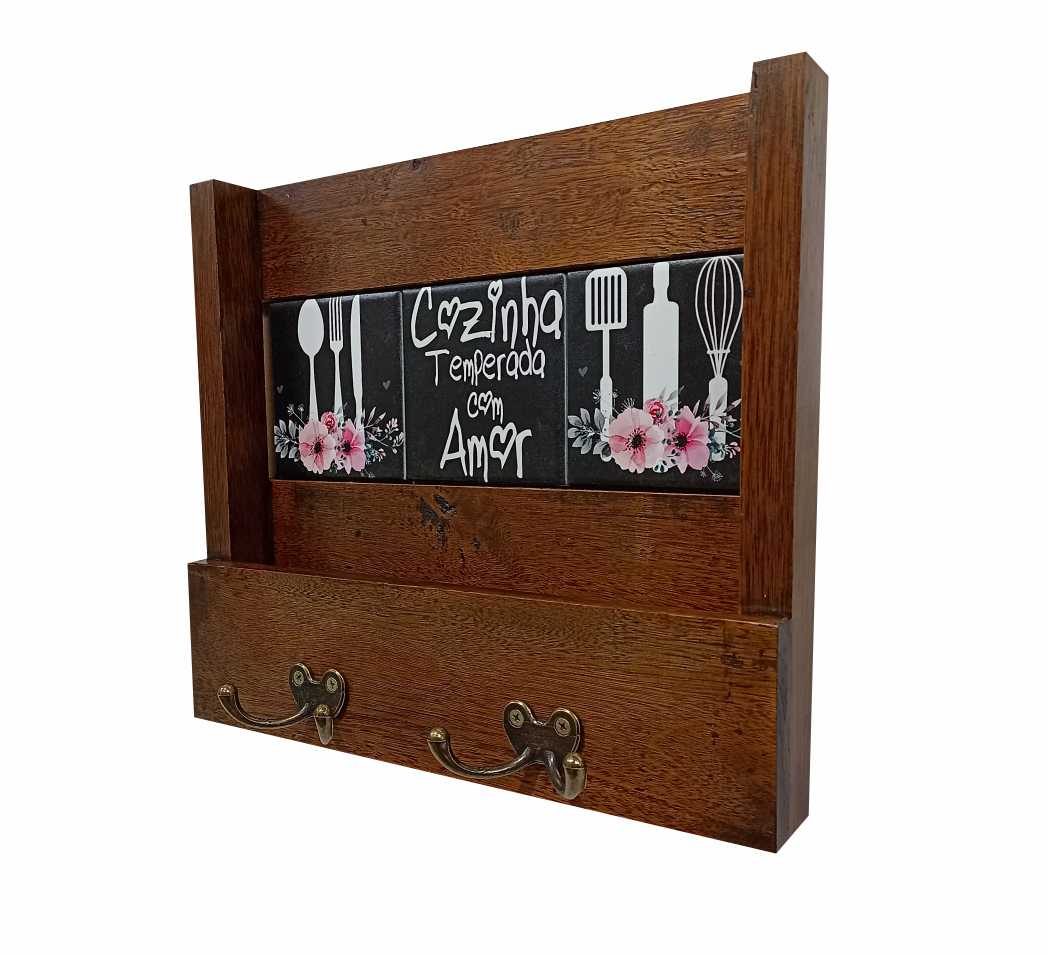 No centro, 3 azulejos cerâmicos com impressão digital conferem um ar de modernidade à peça. Além do aspecto decorativo, o porta chaves tem outras funcionalidades podendo ser utilizado para guardar celulares, escovas, carteira etc.