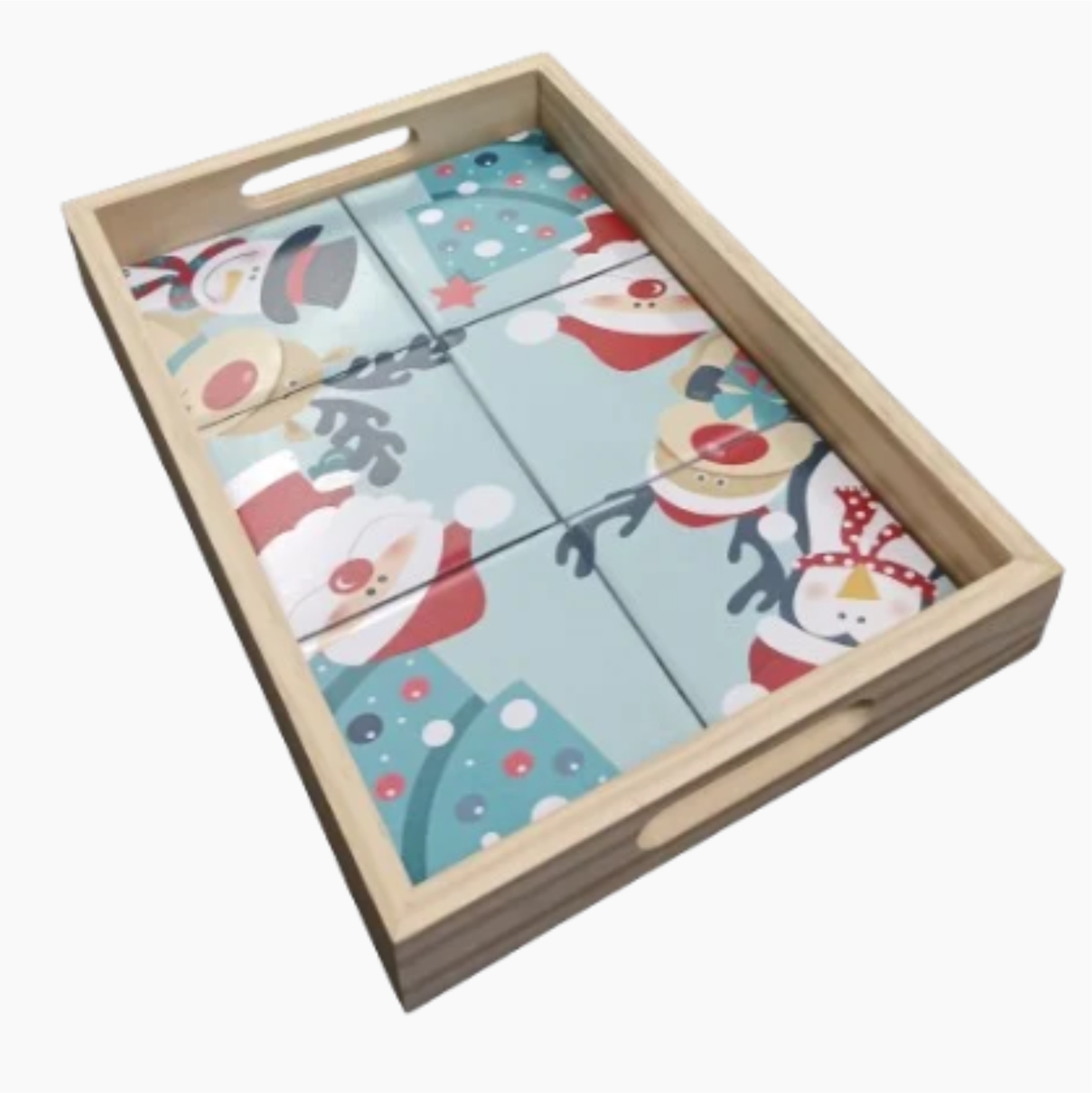Entre no espírito mágico do Natal com a Bandeja de Pinus com Azulejos de Papai Noel! Esta bandeja Papai Noel combina o estilo moderno da madeira de Pinus com a alegria das estampas natalinas em azulejos. É a peça perfeita para quem busca elegância e um toque temático para as festas de fim de ano.
