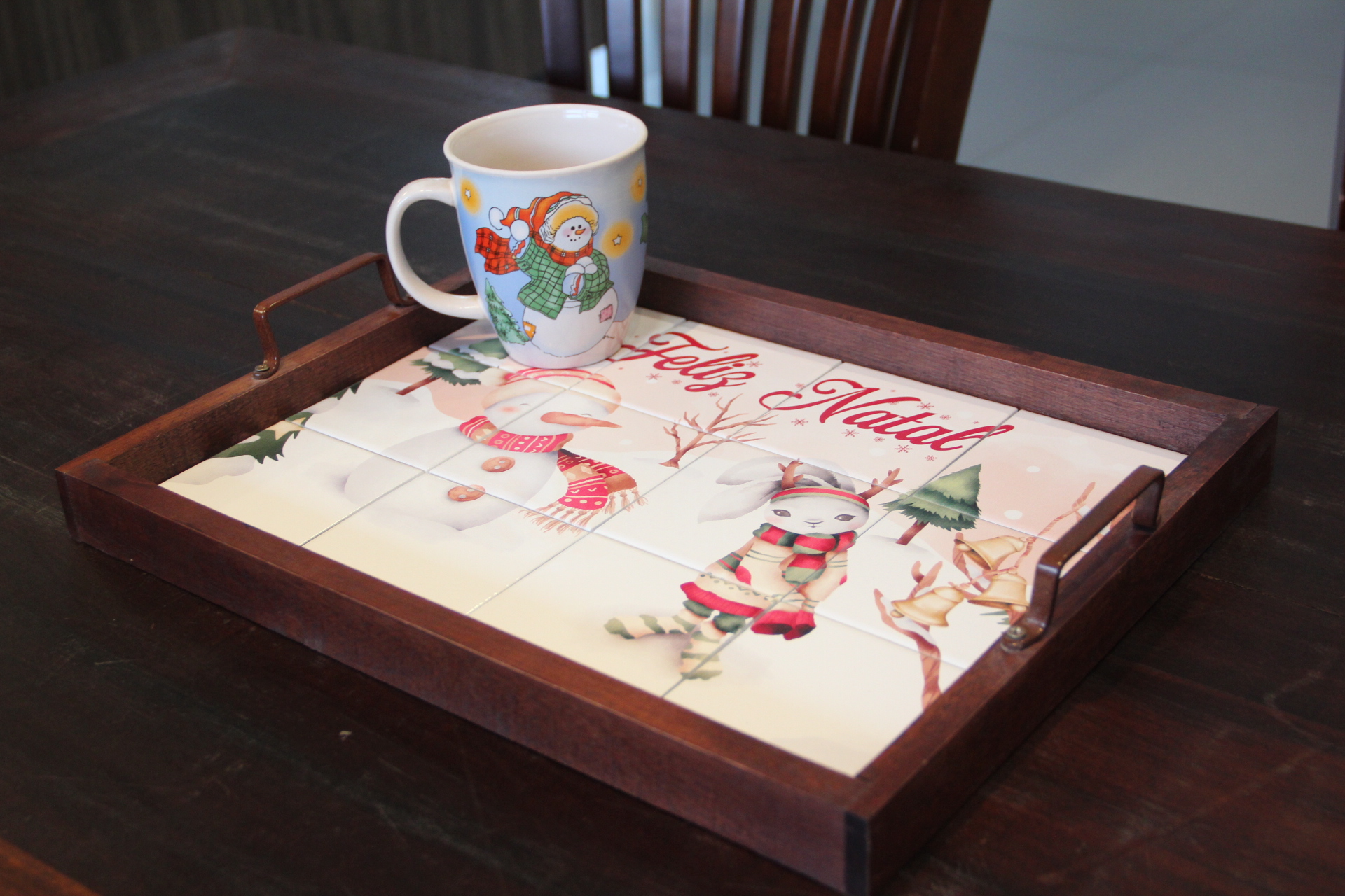 Linda bandeja em madeira natural (Eucalipto de Reflorestamento). O processo de pintura escurece a madeira naturalmente deixando com aspecto envelhecido, realçando os veios da madeira, tornando-o um produto rústico com excelente acabamento.